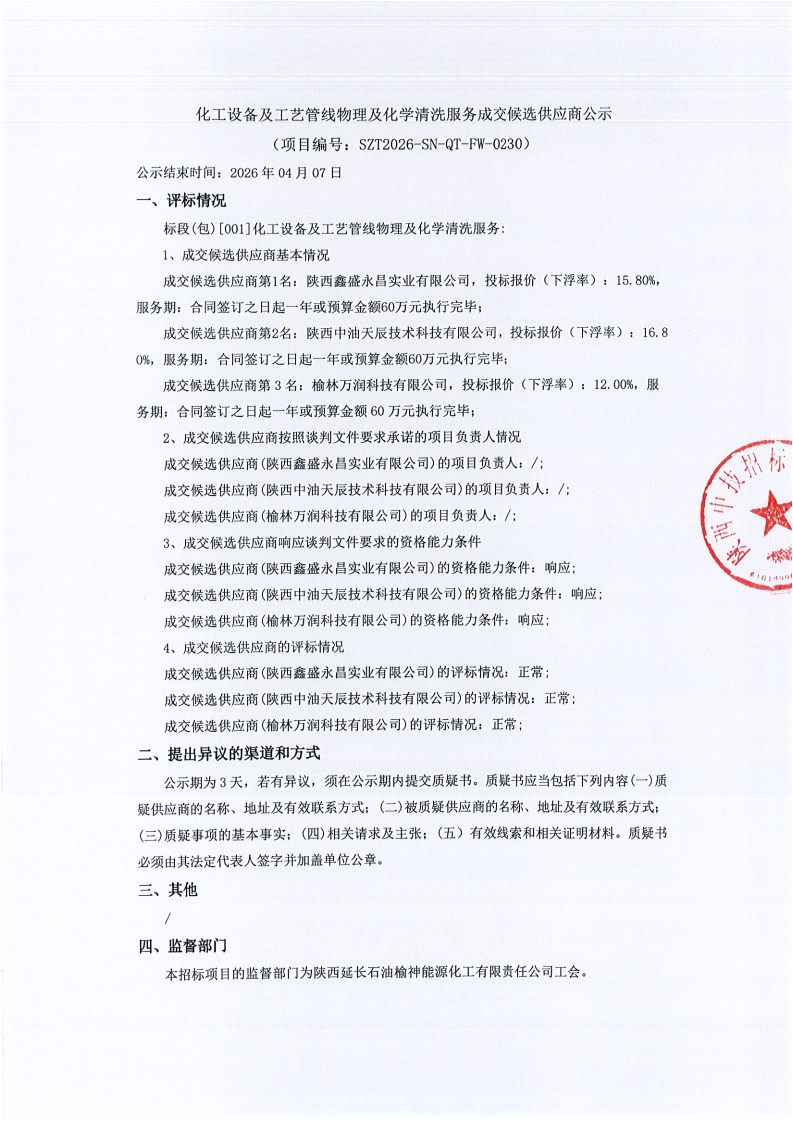 化工设备及工艺管线物理及化学清洗服务成交候选供应商公示