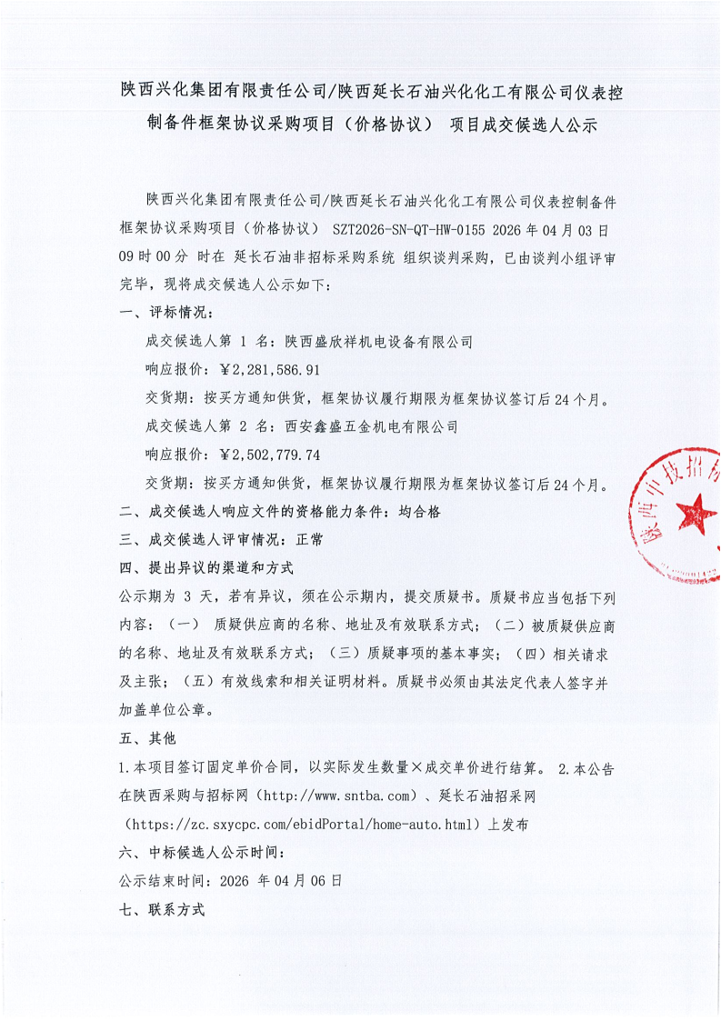 陕西兴化集团有限责任公司、陕西延长石油兴化化工有限公司仪表控制备件框架协议采购项目(价格协议)项目成交候选人公示