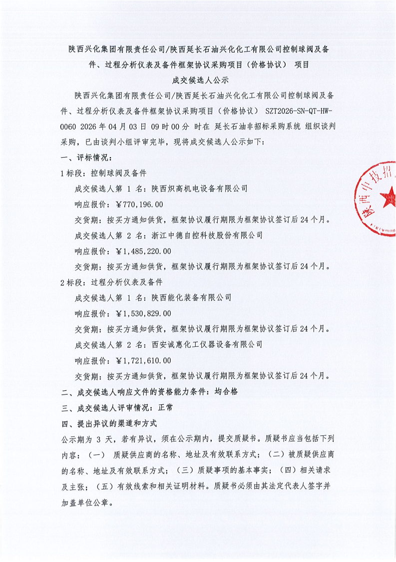 陕西兴化集团有限责任公司、陕西延长石油兴化化工有限公司控制球阀及备件、过程分析仪表及备件框架协议采购项目(价格协议)项目成交候选人公示
