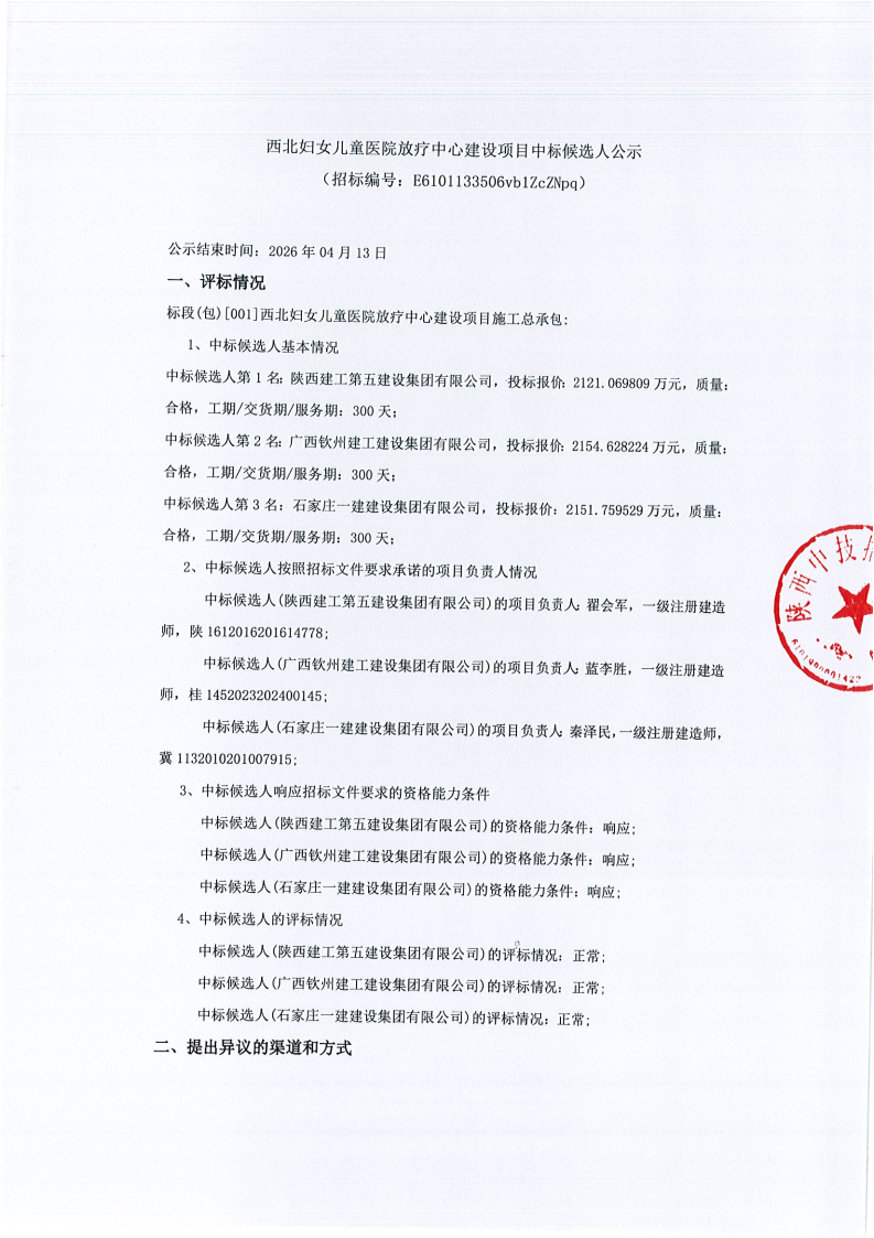 西北妇女儿童医院放疗中心建设项目中标候选人公示