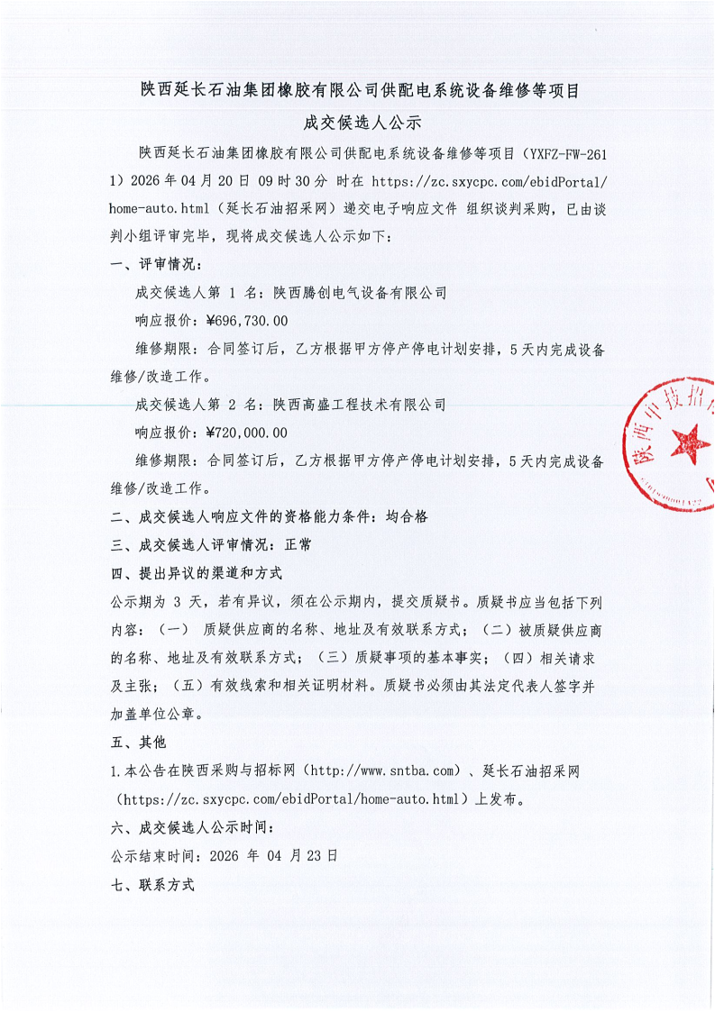 陕西延长石油集团橡胶有限公司供配电系统设备维修等项目成交候选人公示