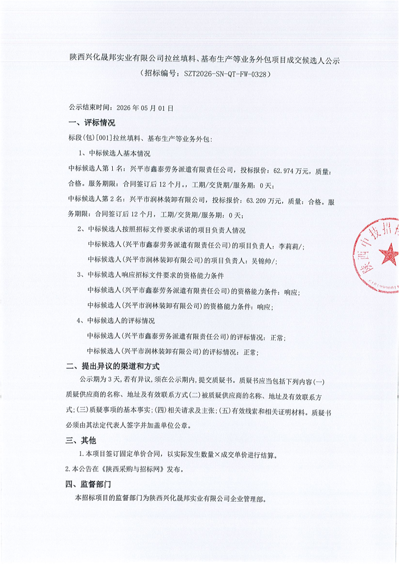 陕西兴化晟邦实业有限公司拉丝填料、基布生产等业务外包项目成交候选人公示