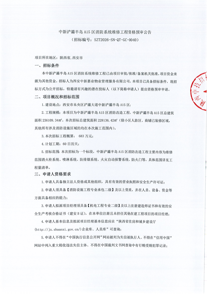 中新浐灞半岛A15区消防系统维修工程资格预审公告